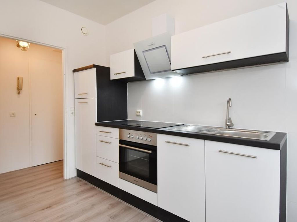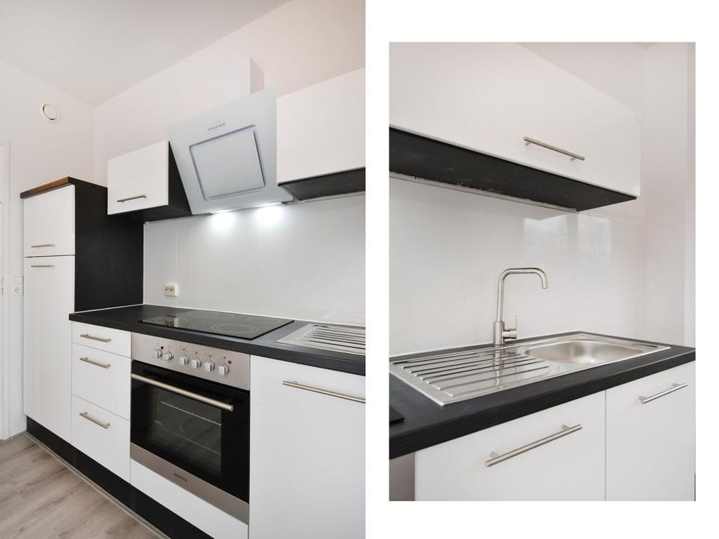 Moderne keuken (ca. 3.77 x 2.23m) met 4-pits inductiekookplaat, oven, diagonale afzuigkap en koelkast, vriezer en vaatwasser.