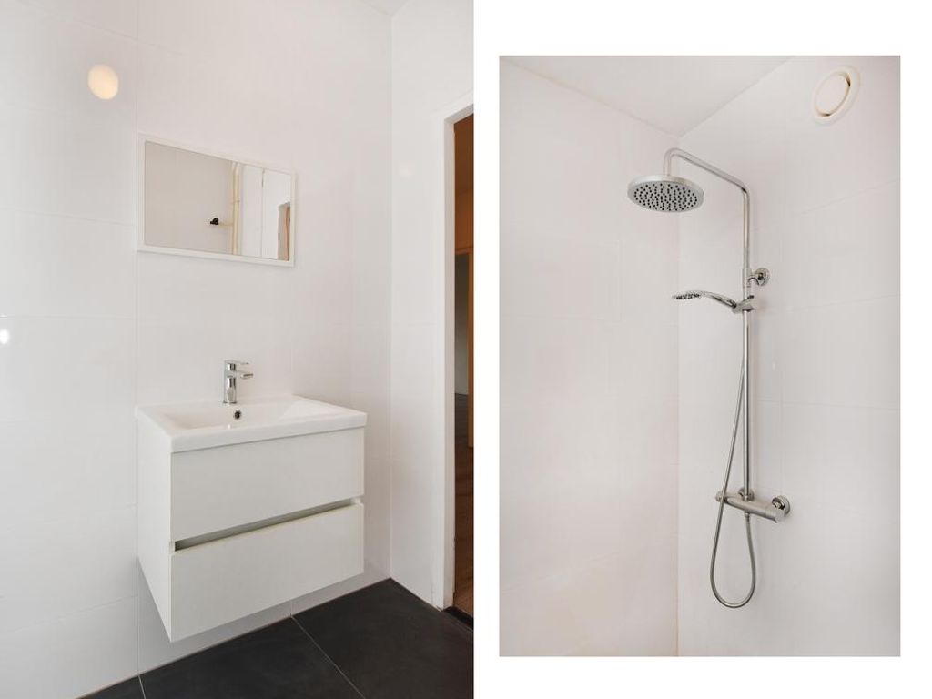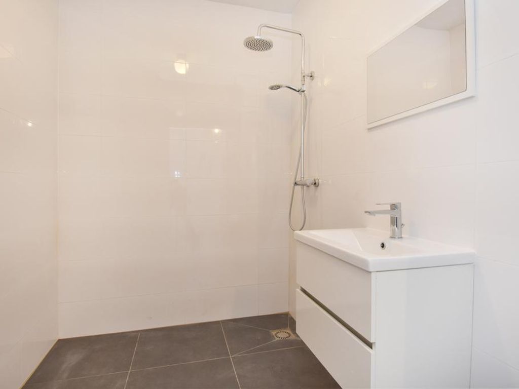 Moderne badkamer (ca. 2.23 x 1.49m) beschikt over een inloopdouche, wastafel en wasmachineaansluiting.