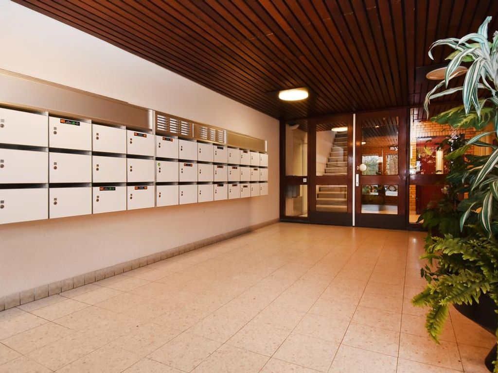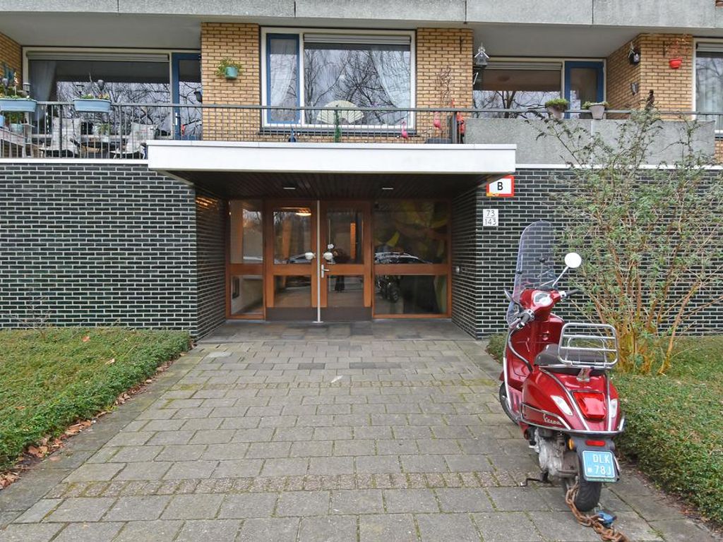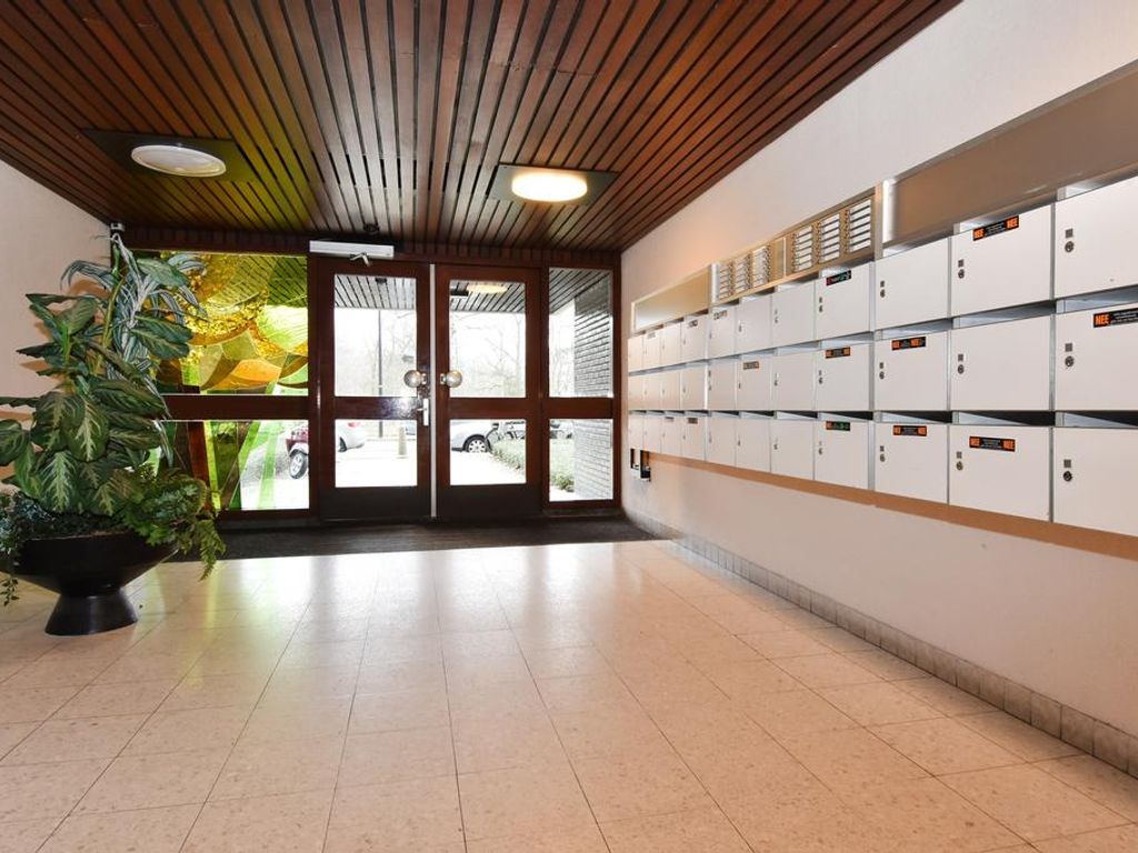 Toegang via gesloten portiek met bellentableau, intercom en brievenbussen.