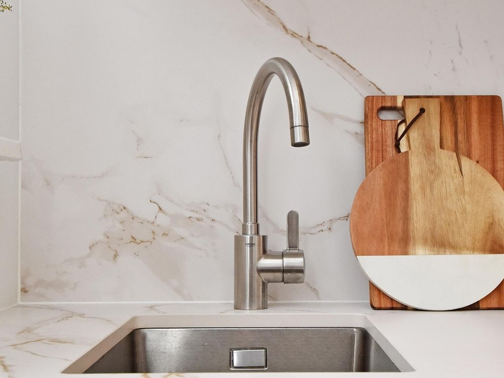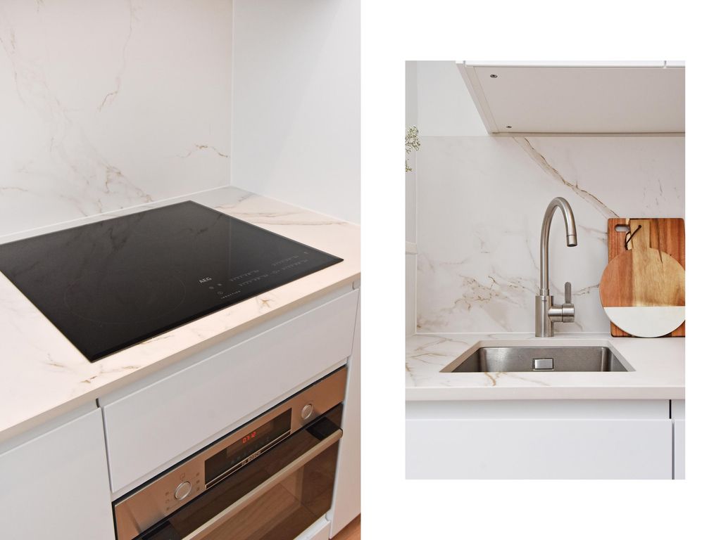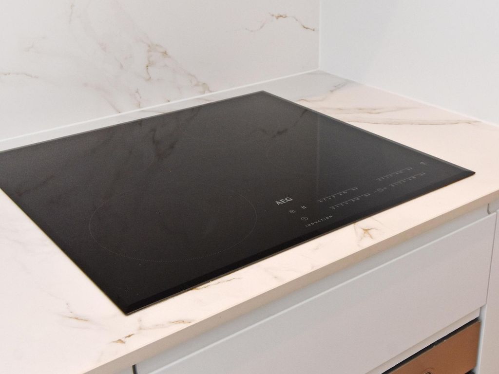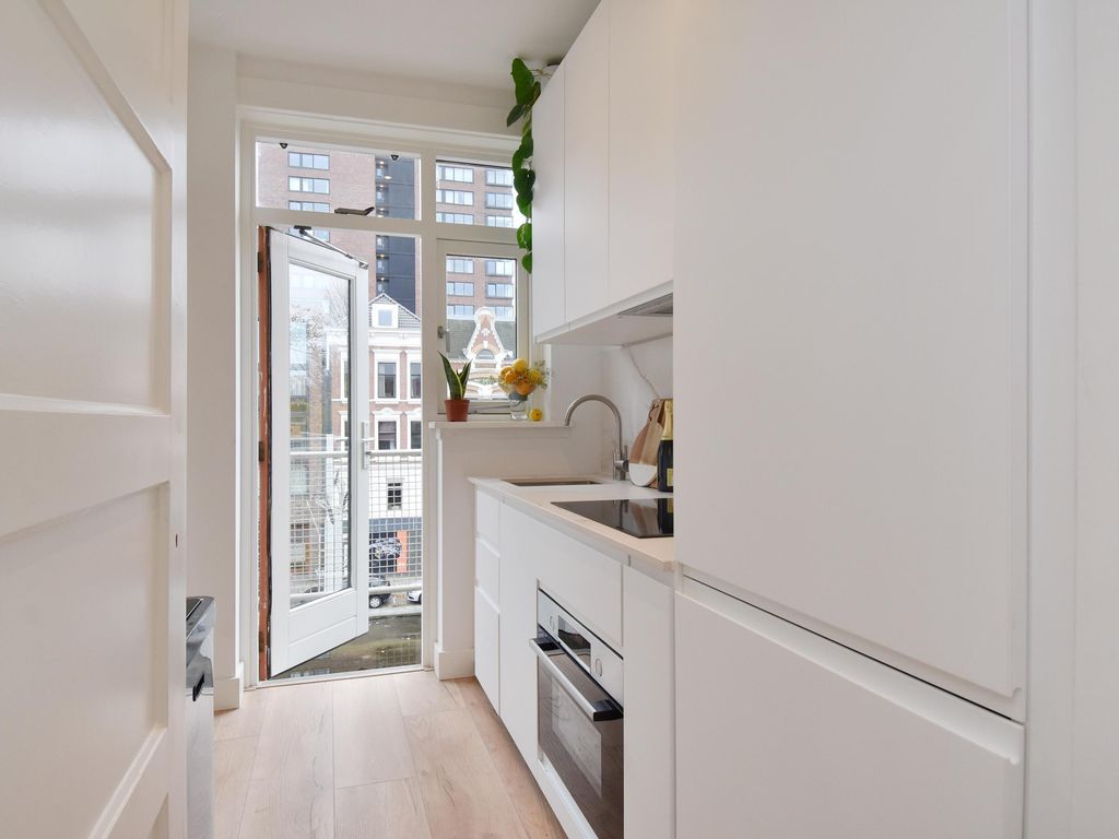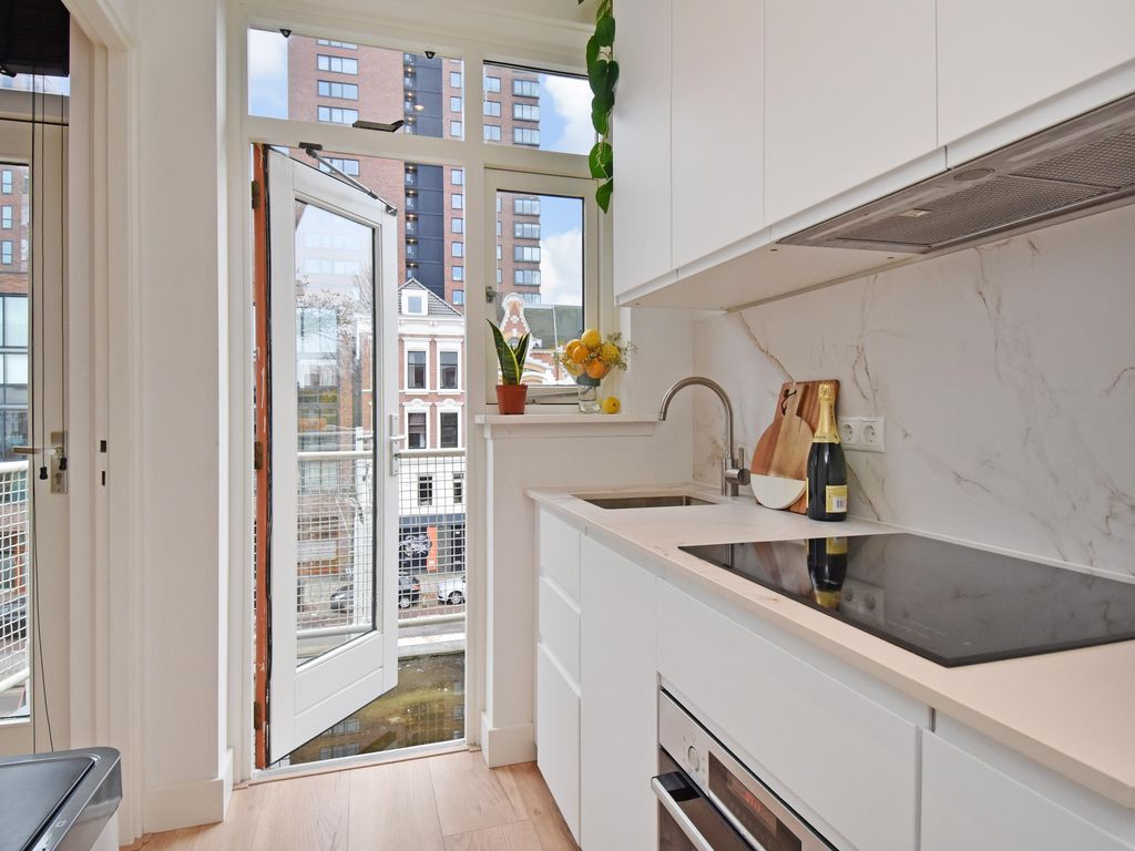 Moderne half open keuken (ca. 2.49 x 1.75m) met 4-pits inductiekookplaat, afzuigkap, combimagnetron, koelkast, vriezer, vaatwasser en deur naar het balkon.