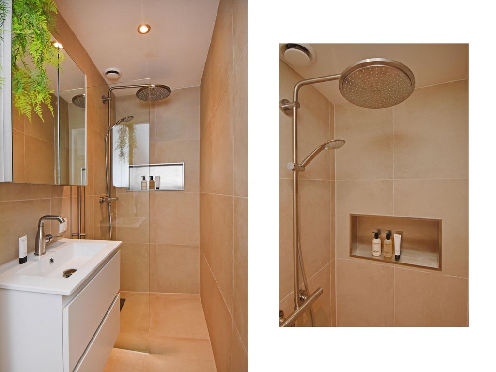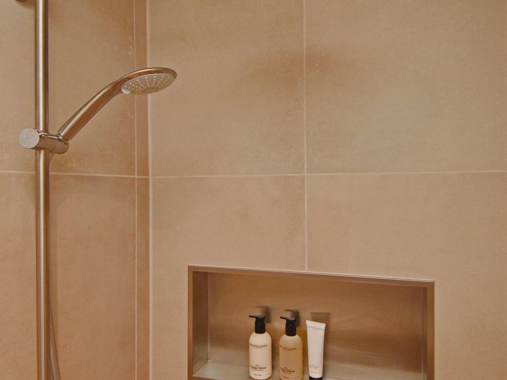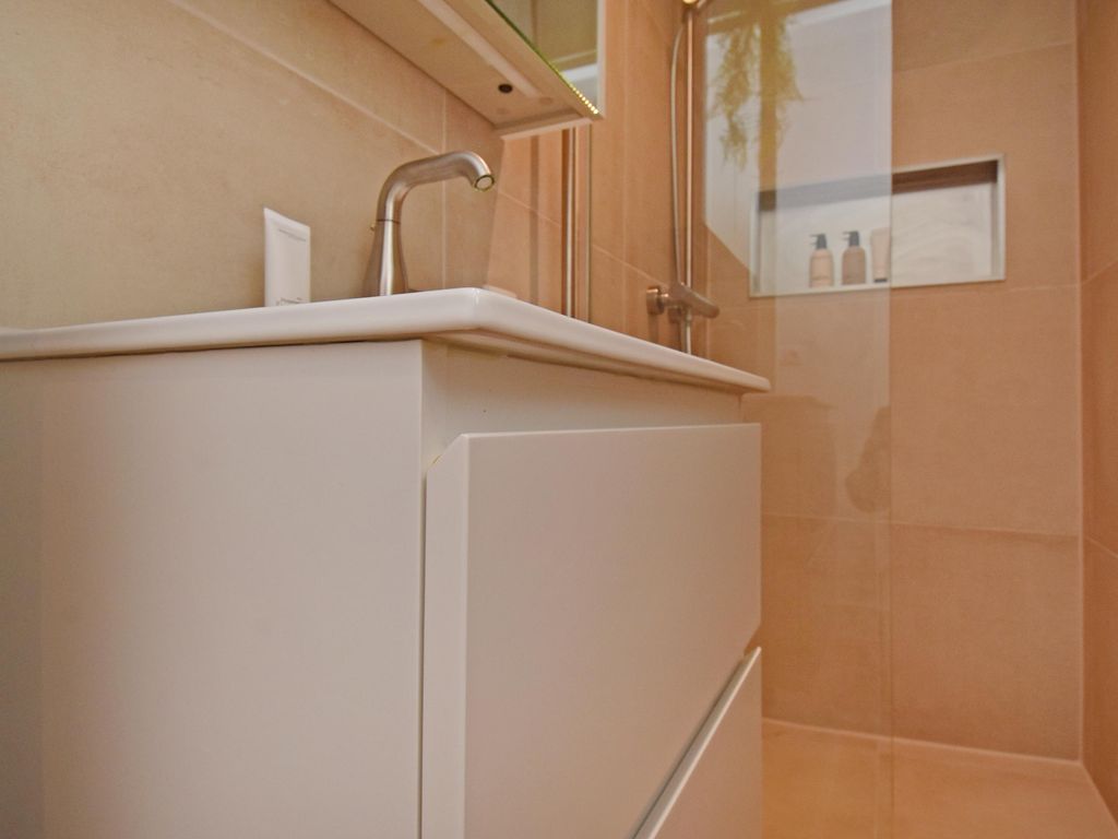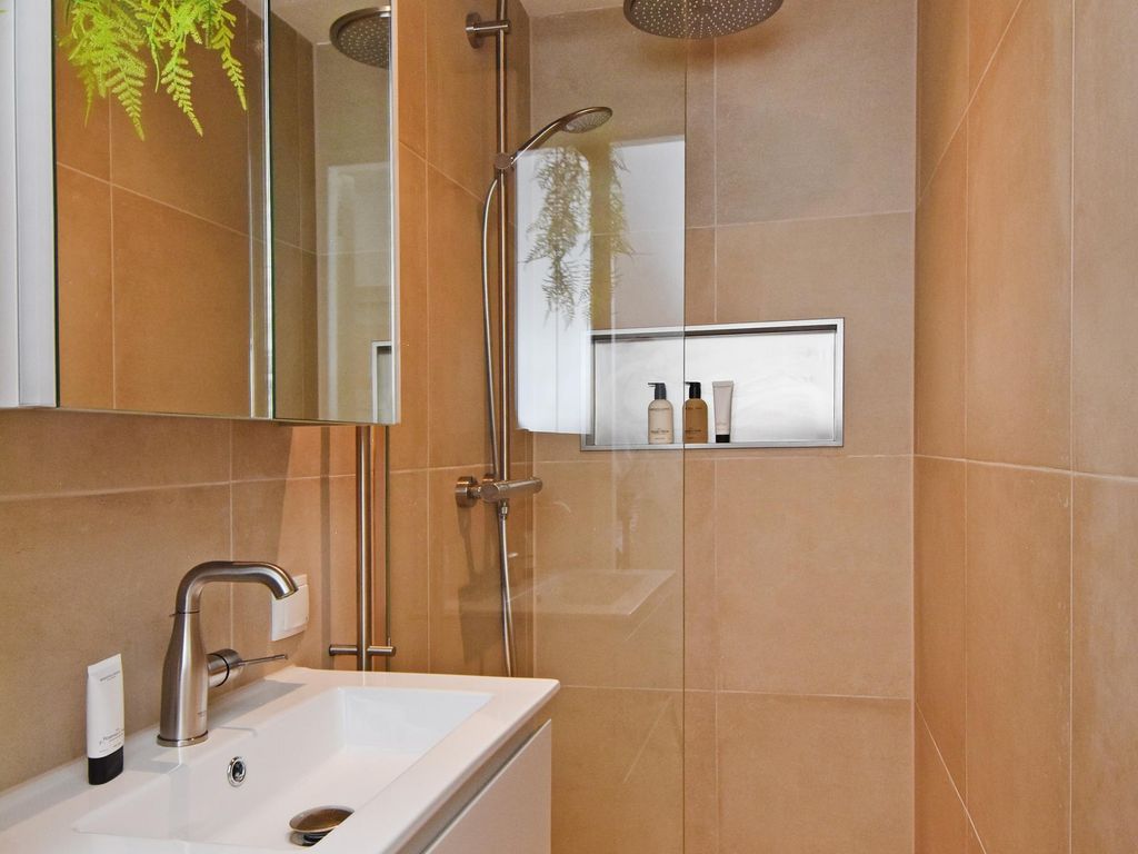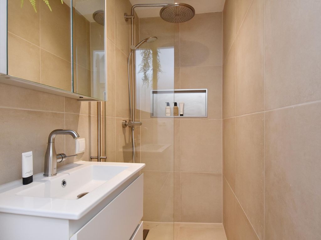 Fraaie luxe badkamer (ca. 1.84 x 0.91m) met douche, wastafelmeubel en mechanische ventilatie.