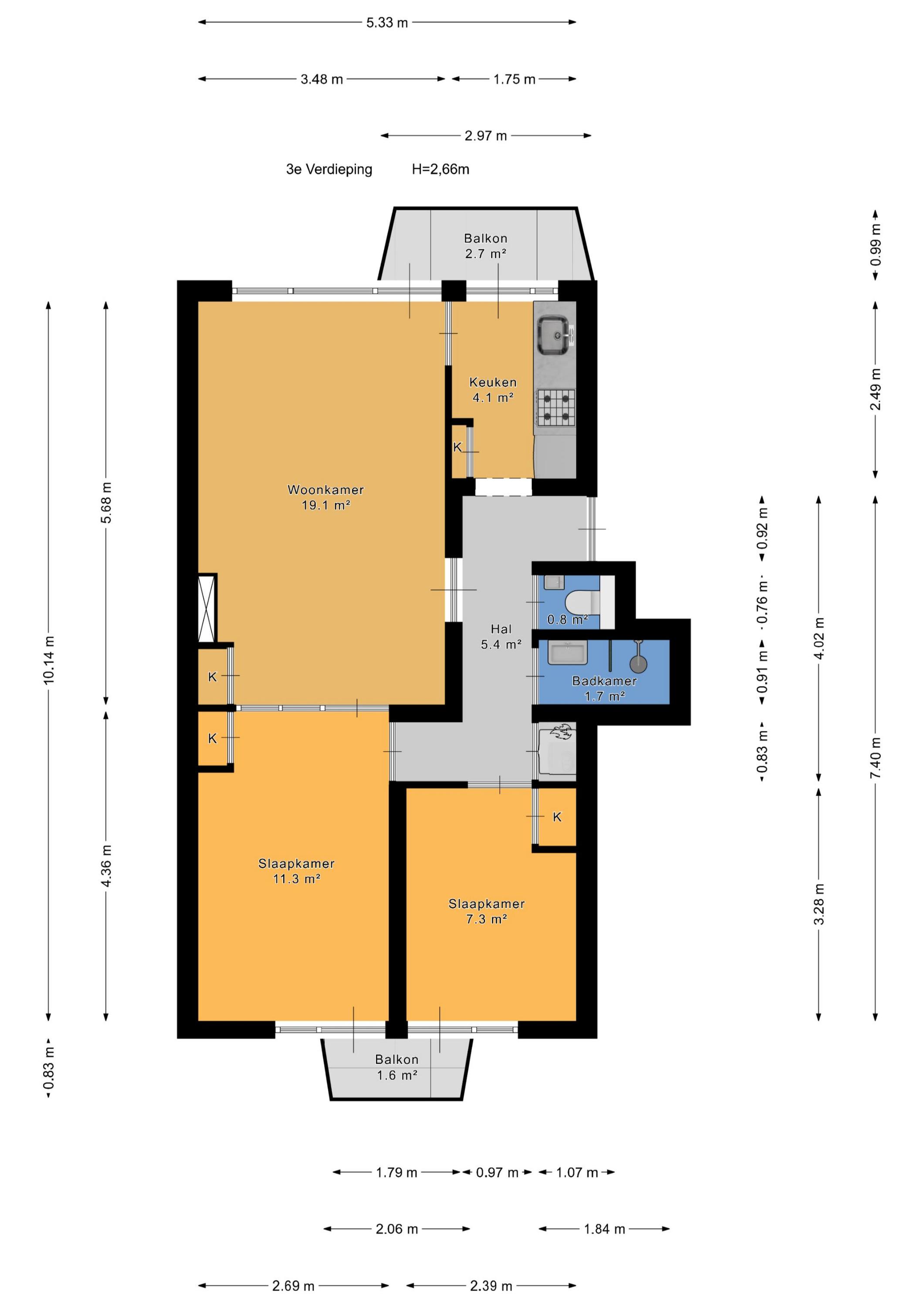 Toegang via gesloten portiek met brievenbussen, bellentableau en intercom, trap naar 3e etage, entree, hal met modern separaat toilet en toegang tot alle vertrekken.