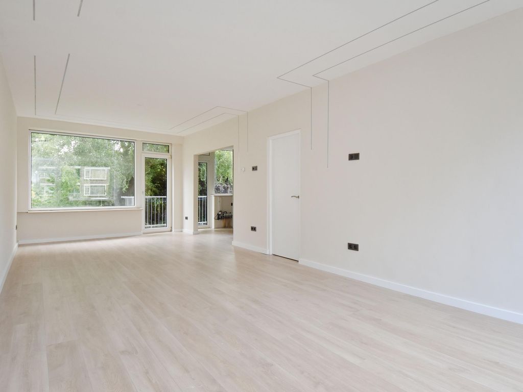 Ruime doorgebroken wooneetkamer (ca. 8.63 x 3.51m) met grote raampartijen, veel lichtinval en deur naar het balkon.