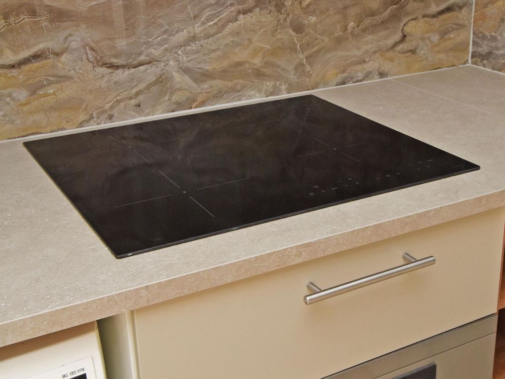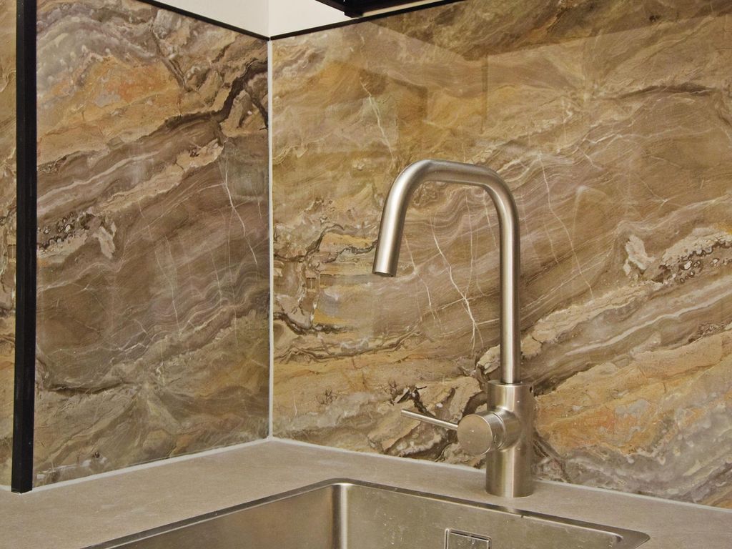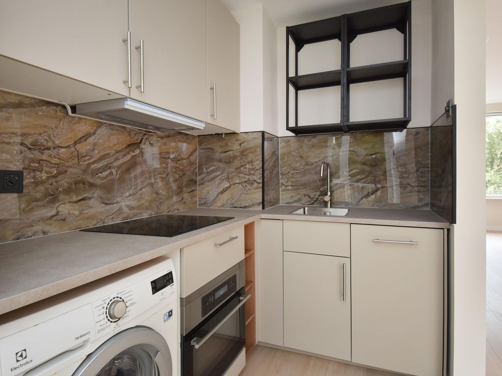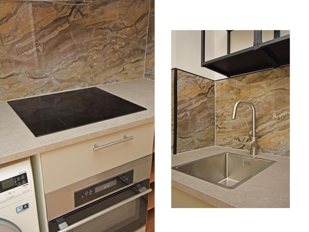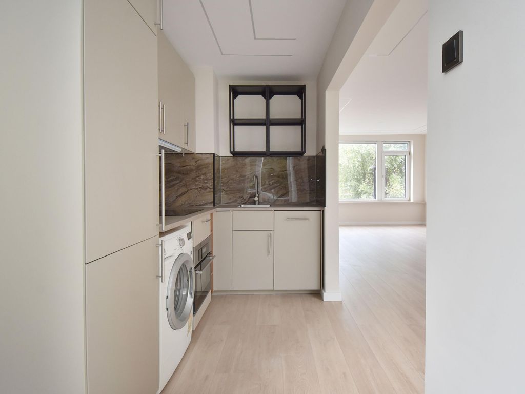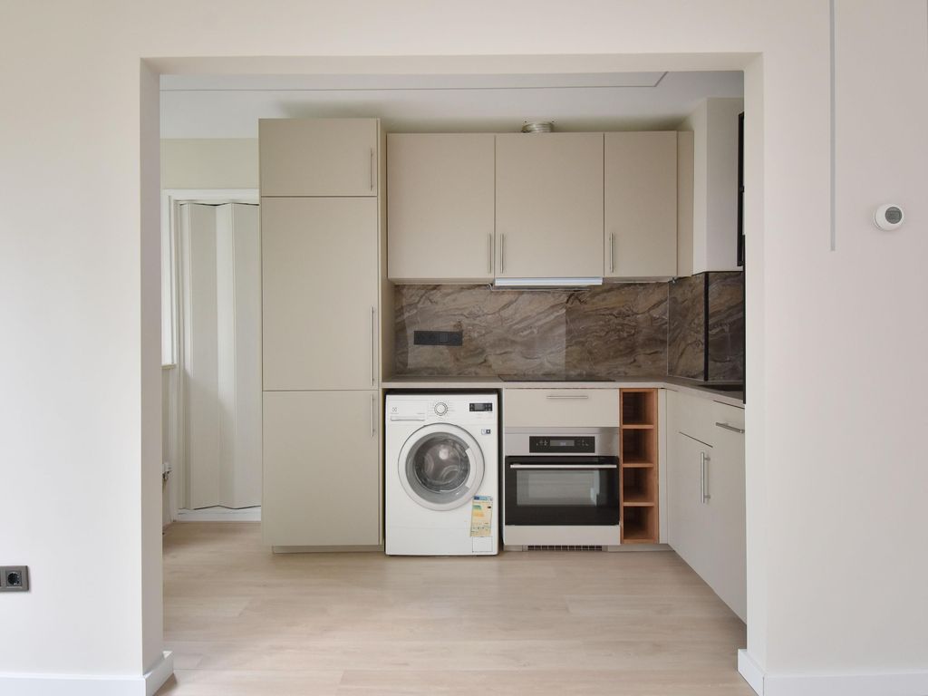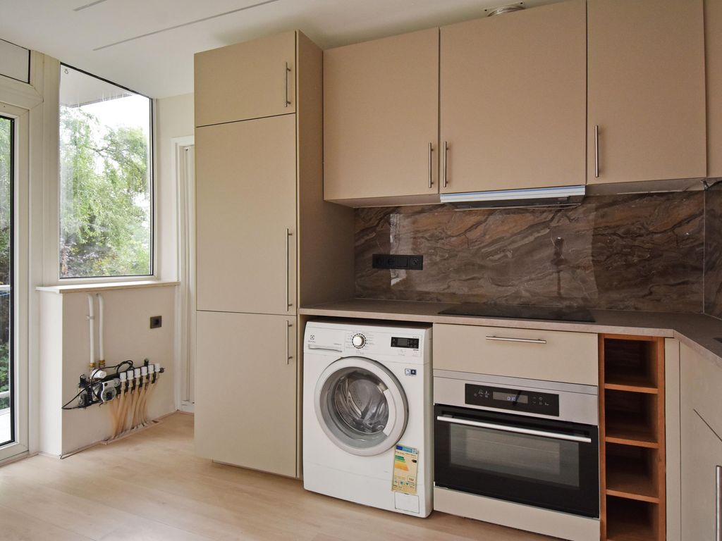 Moderne luxe keuken (ca. 3.51 x 1.67m) met 4-pits inductiekookplaat, afzuigkap, koelkast, combi-oven, koelkast, vaatwasser, wasmachine en deur naar het balkon.