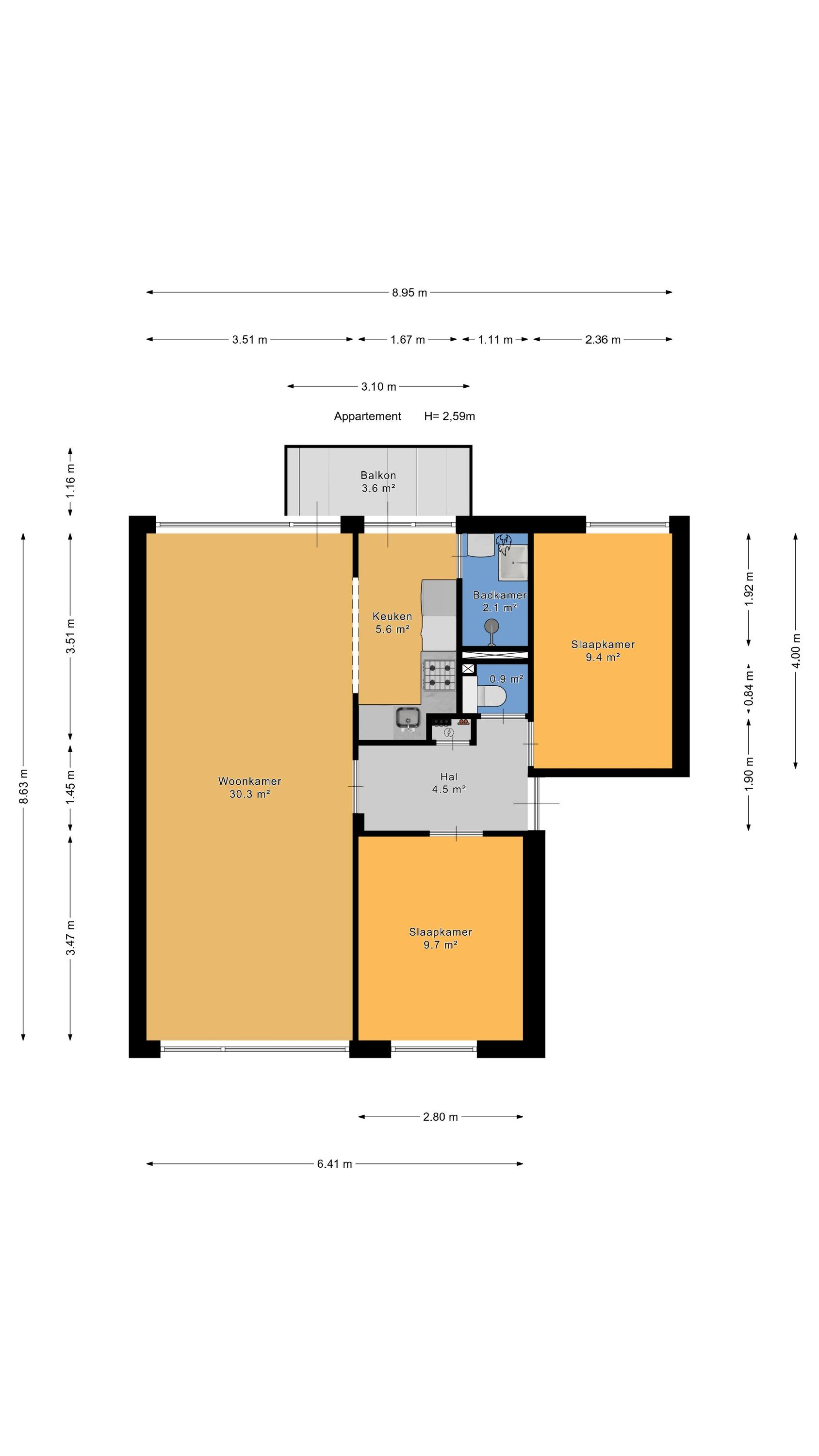 Balkon (ca. 3.10 x 1.16m) aan de achterzijde.