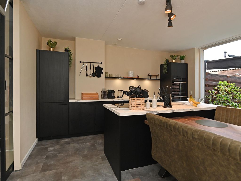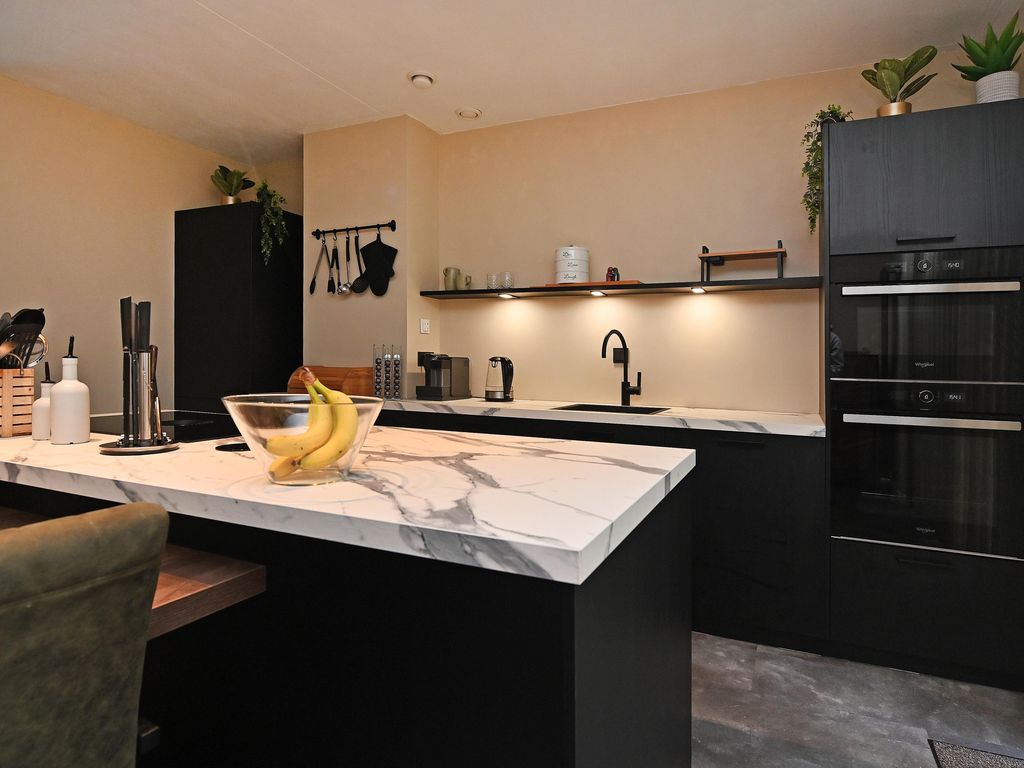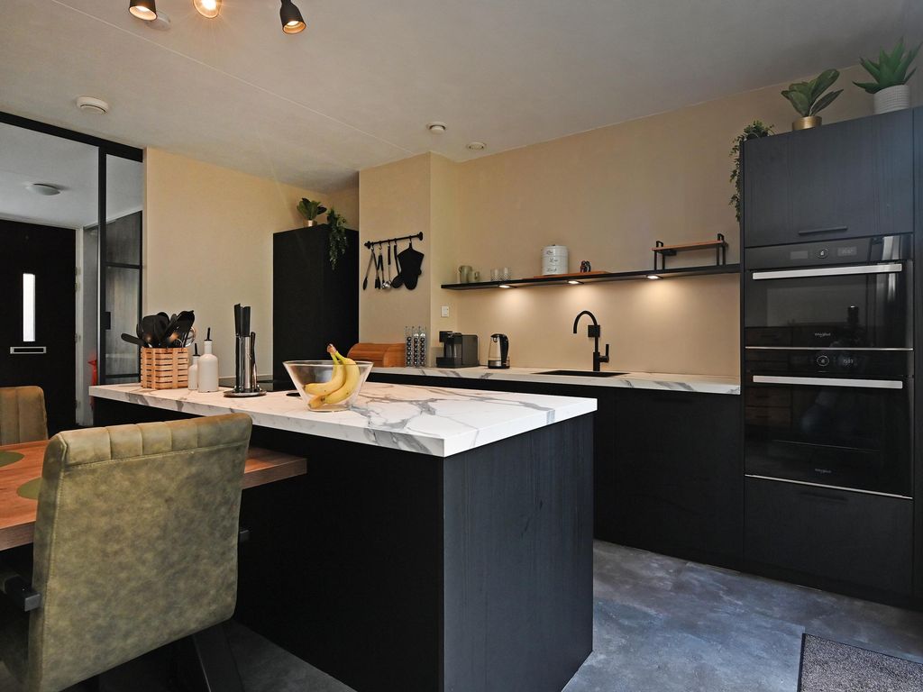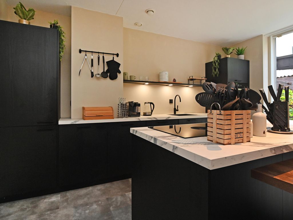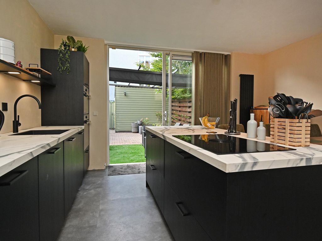 Grote luxe woonkeuken (ca. 4.5 x 4.37m) met kookeiland, 4-pits inductiekookplaat met kookveldafzuiging, oven, combi magnetron, koelkast, vriezer, vaatwasser en deur naar de achtertuin.
