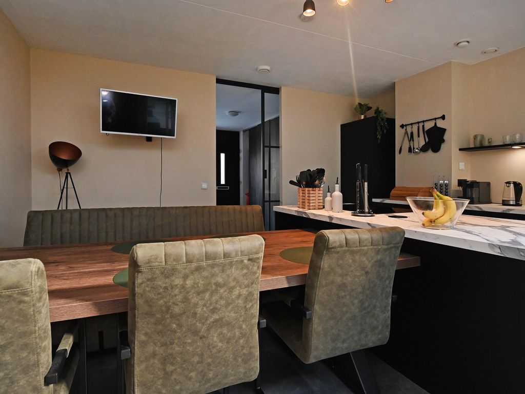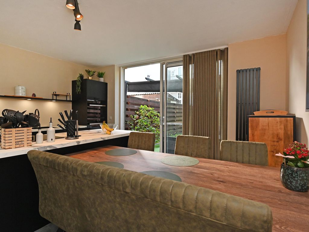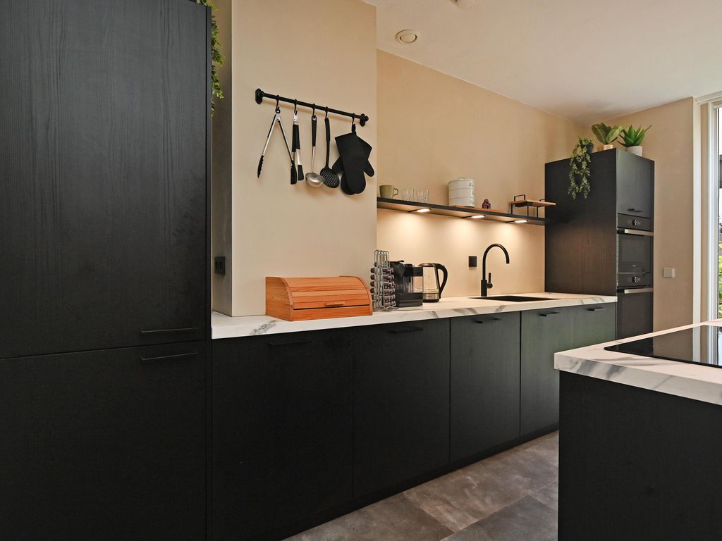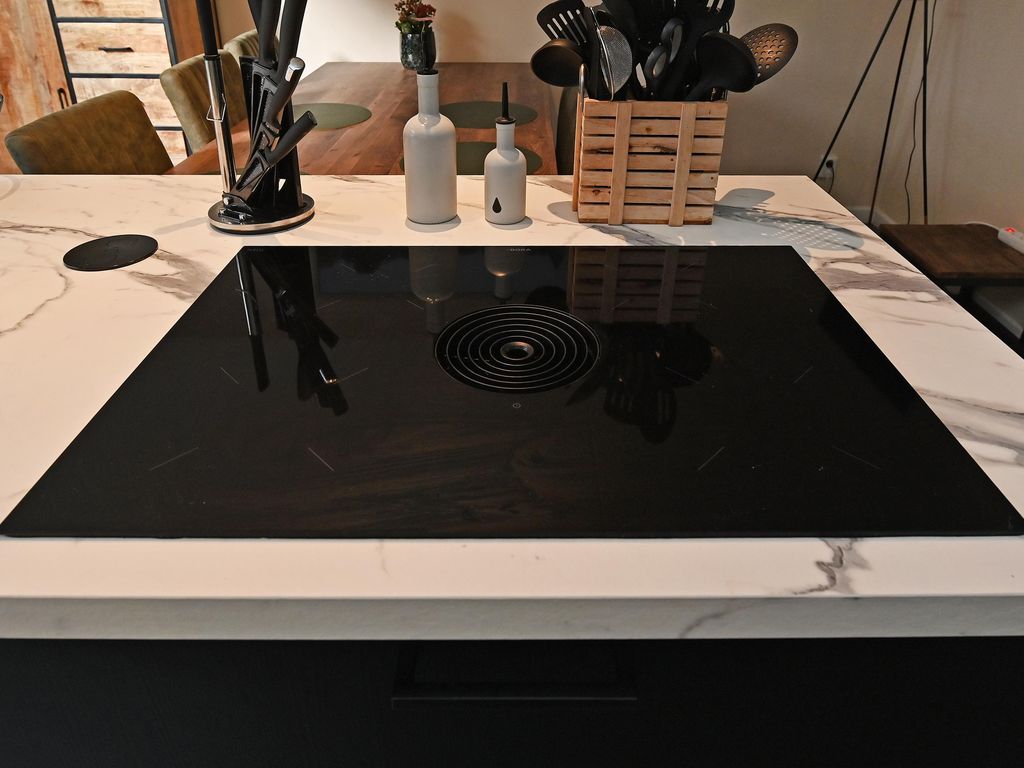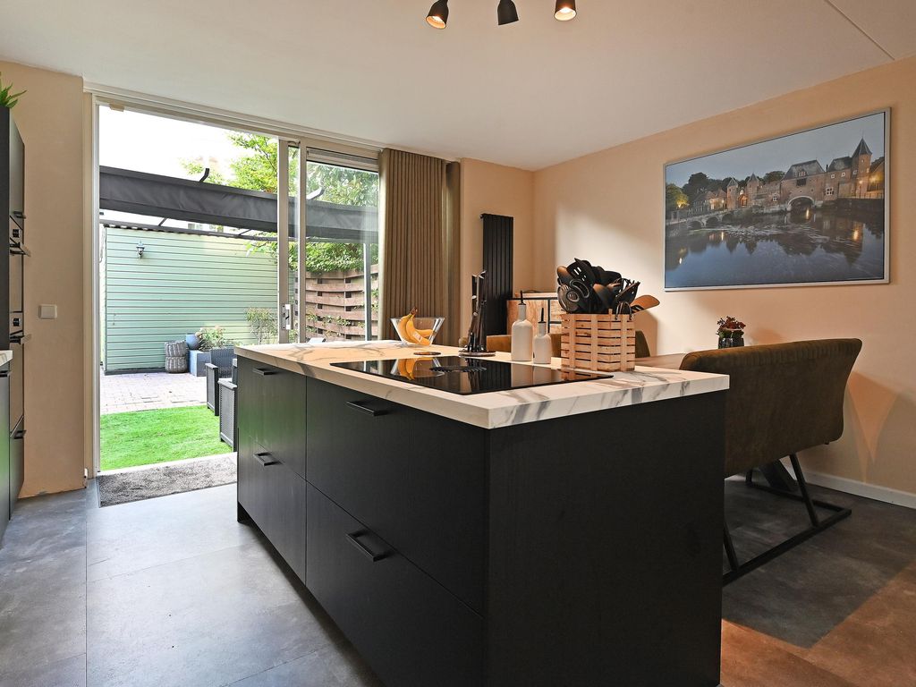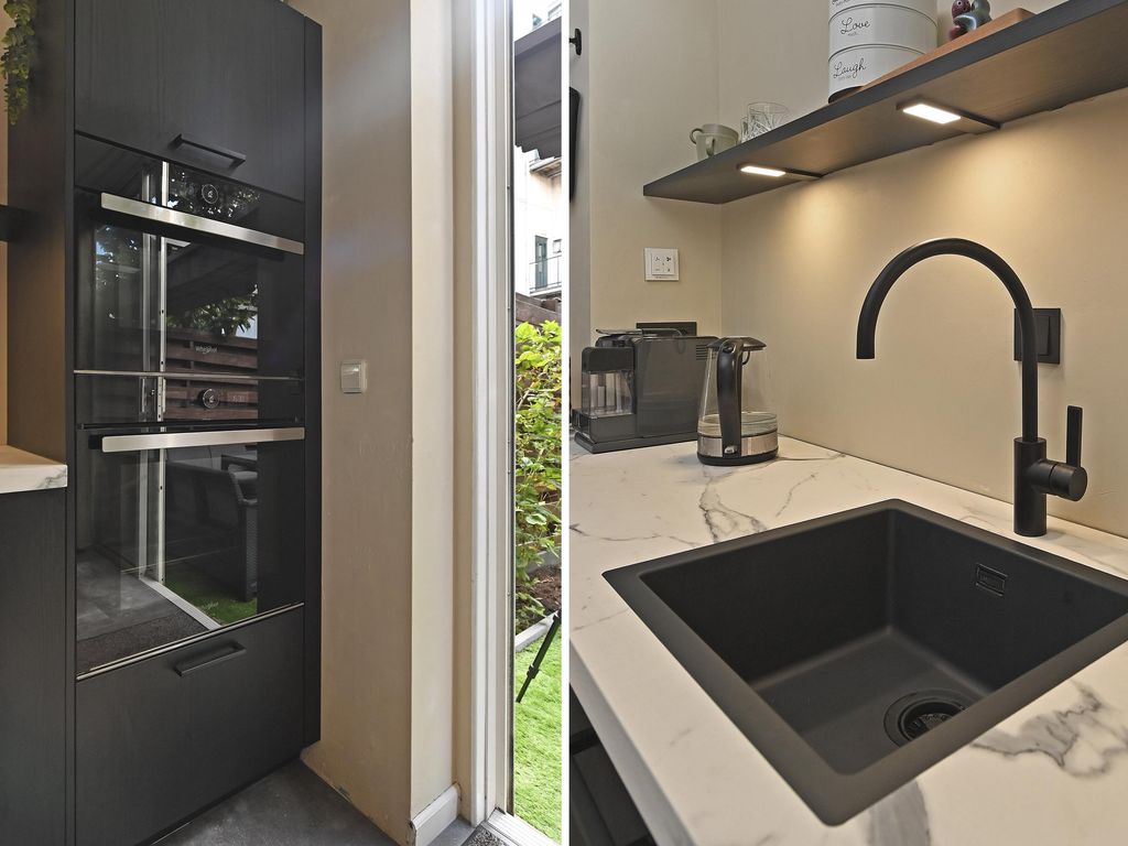 Grote luxe woonkeuken (ca. 4.5 x 4.37m) met kookeiland, 4-pits inductiekookplaat met kookveldafzuiging, oven, combi magnetron, koelkast, vriezer, vaatwasser en deur naar de achtertuin.