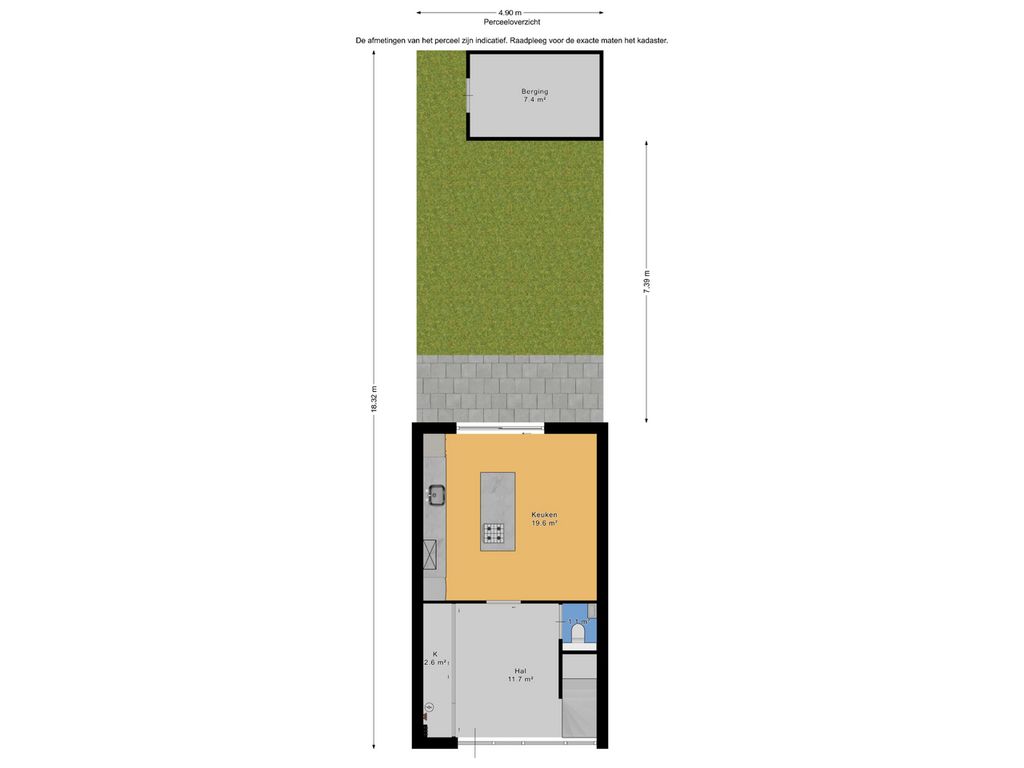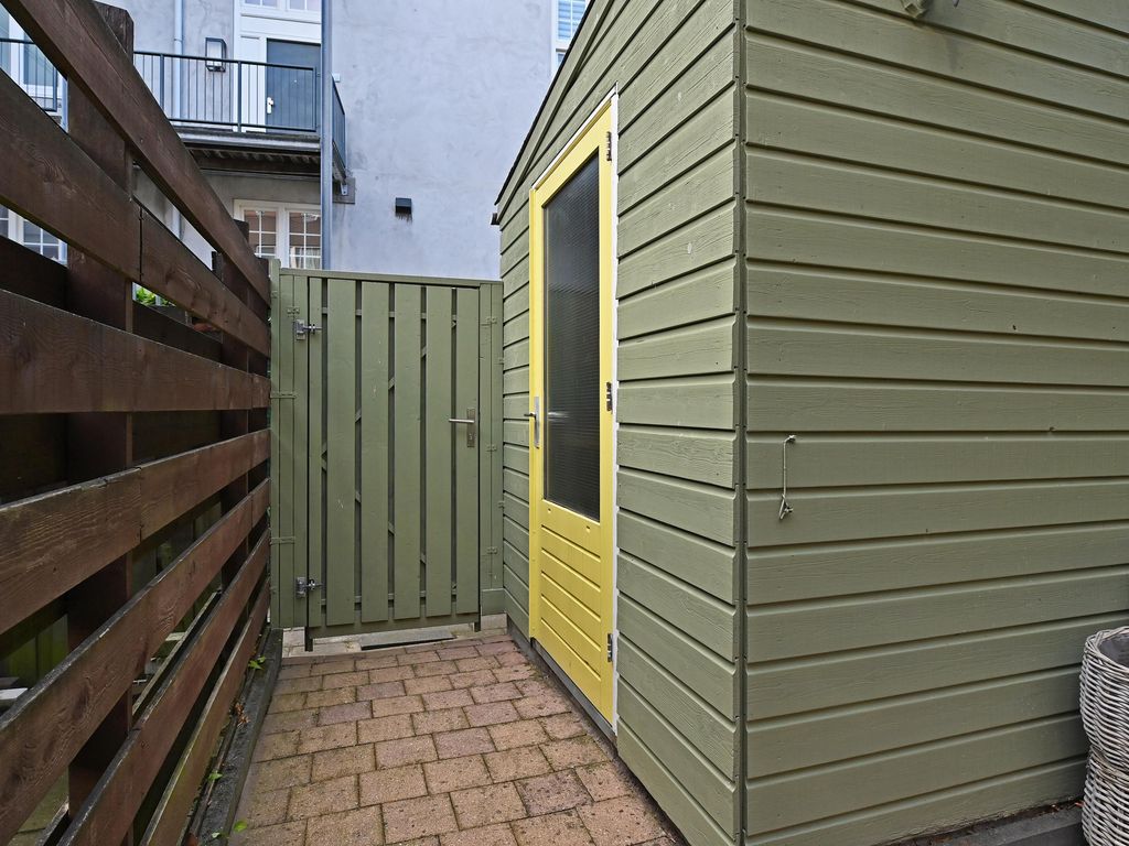 Royale achtertuin (ca. 9.56 x 4.90m) met houten schuur met elektra en achterom via gesloten achterpad.