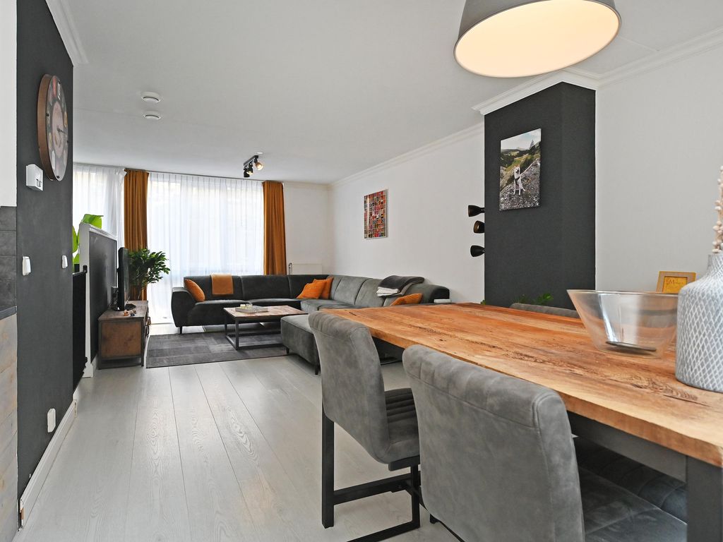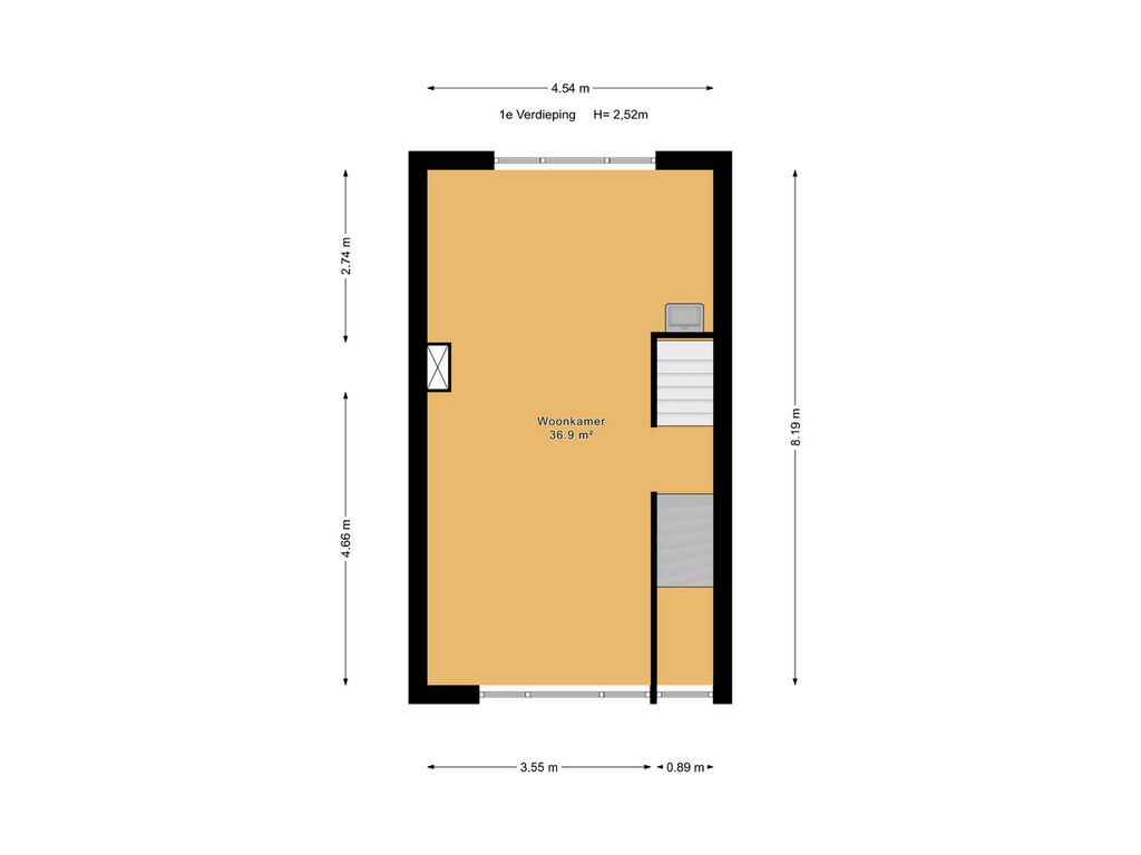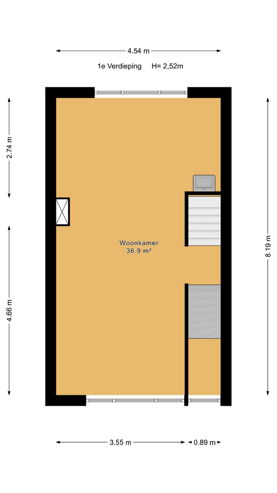 Grote wooneetkamer (ca. 8.19 x 4.54/3.55m) met aan 2 zijden lichtinval.