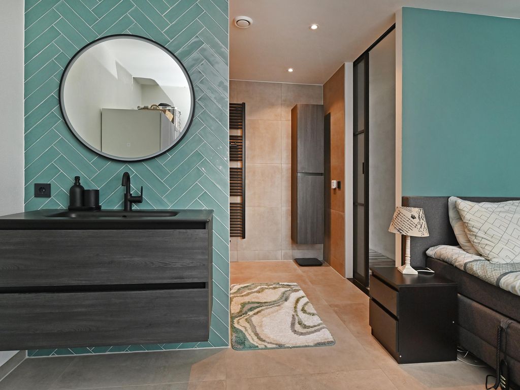 2e mooie badkamer ensuite (ca. 1.76 x 1.73m) met ligbad en wastafelmeubel.