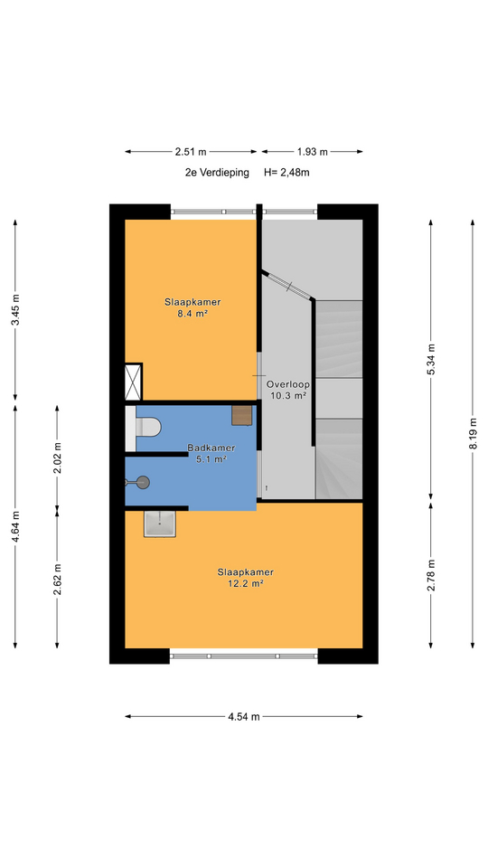 Grote voorslaapkamer (ca. 4.54 x 2.78/2.62m).