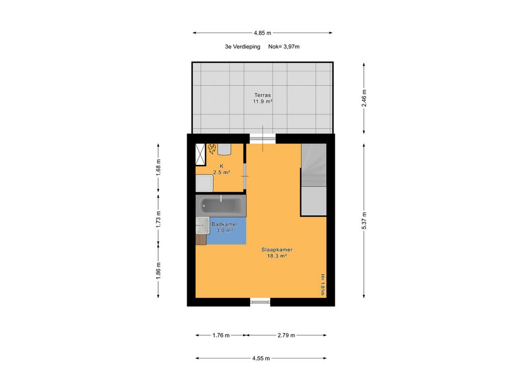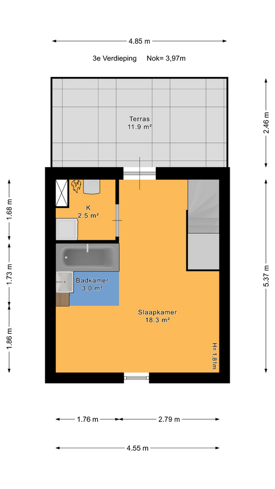Groot dakterras (ca. 4.85 x 2.46m) gelegen op het Westen