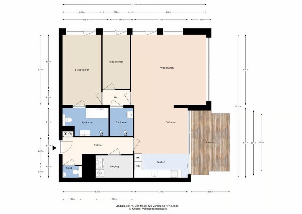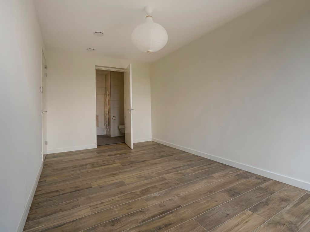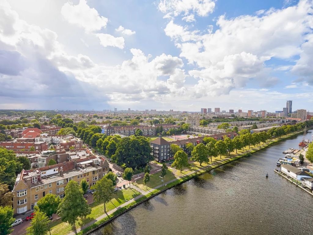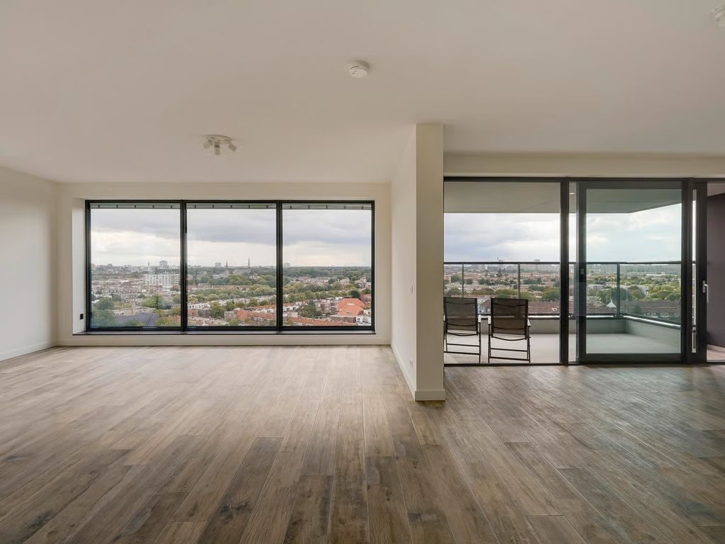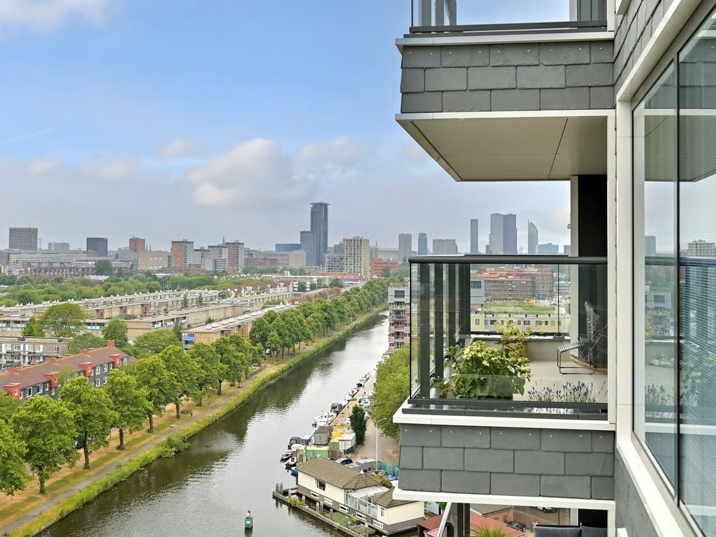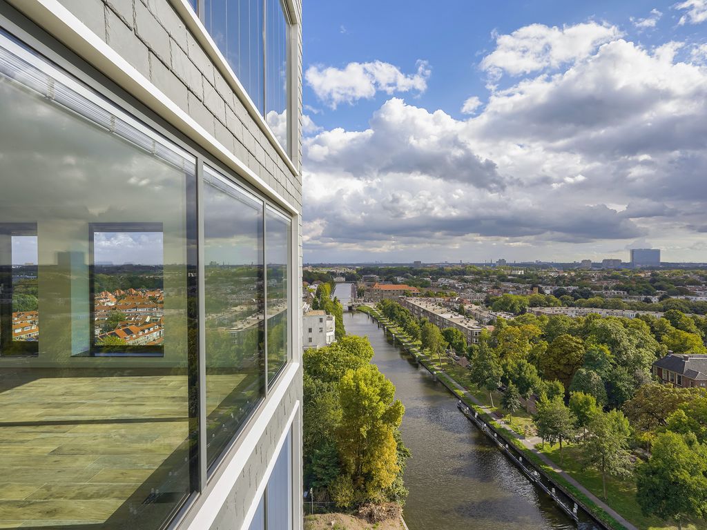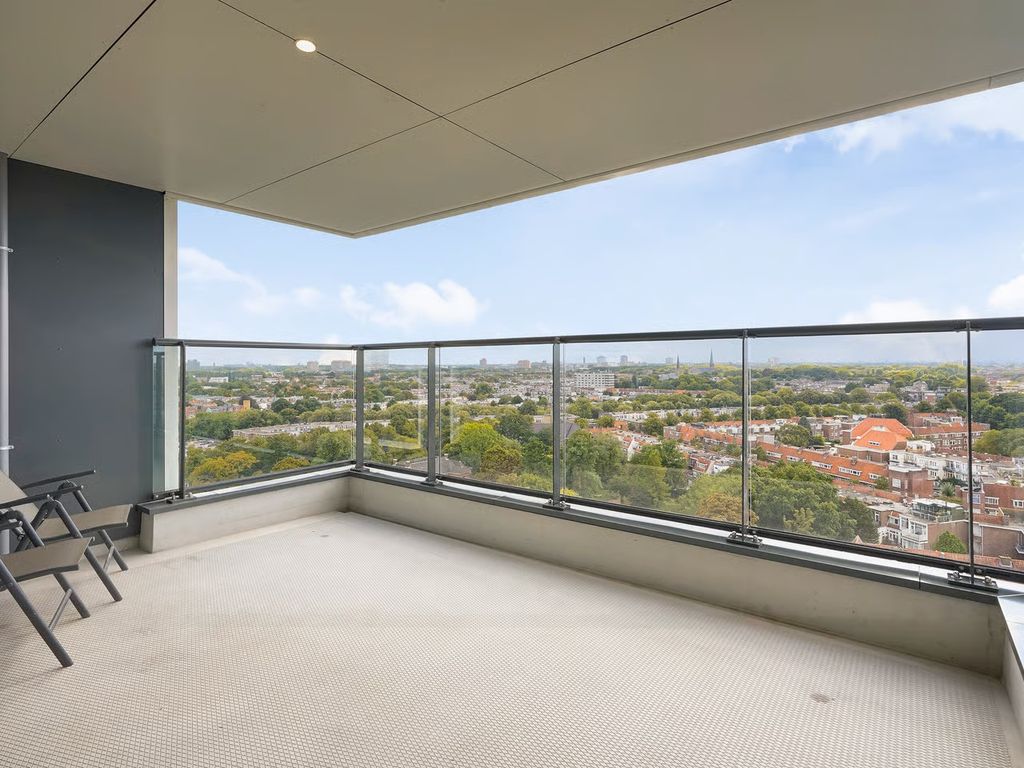 Groot terras (ca. 5.04 x 3.05 m) op het Zuidwesten, zeer gunstig gelegen op de middag- en avondzon en met schitterend uitzicht over het water en de skyline van Den Haag