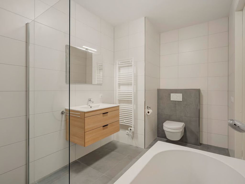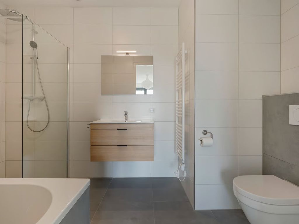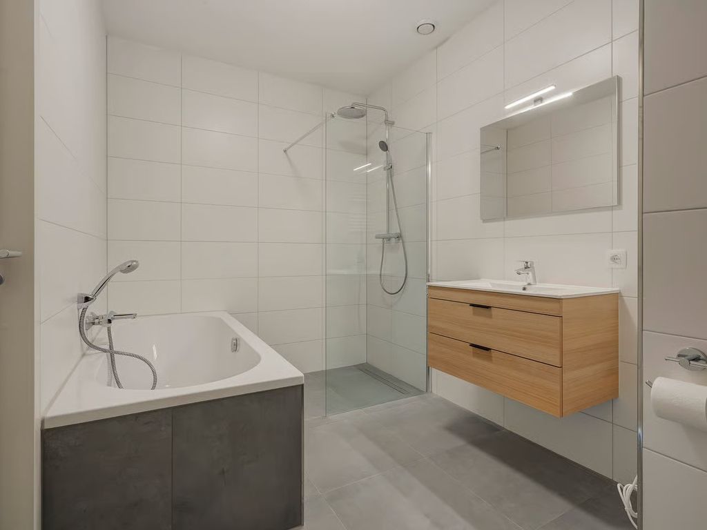 Grote 1e badkamer (ca. 3.59 x 2.18m) met ligbad, separate inloopdouche, breed wastafelmeubel met grote lades, designradiator en 2e toilet.