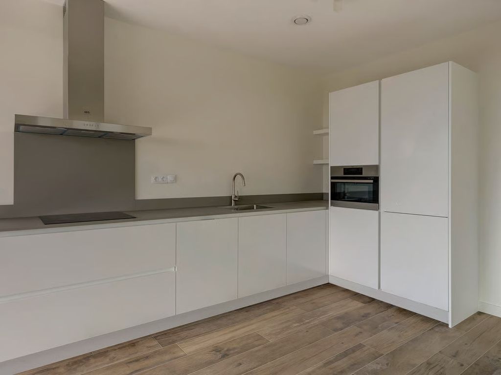 Moderne open keuken met keukenblok in hoekopstelling, 4-pits inductiekookplaat, afzuigkap, oven, koelkast, vriezer en vaatwasser.